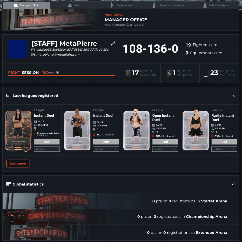 In this page every step in your manager's career is tracked and will help you reach higher heights. The record of your past fights as well as an overview of your current registrations are displayed for you to have a quick recap of what's going on.