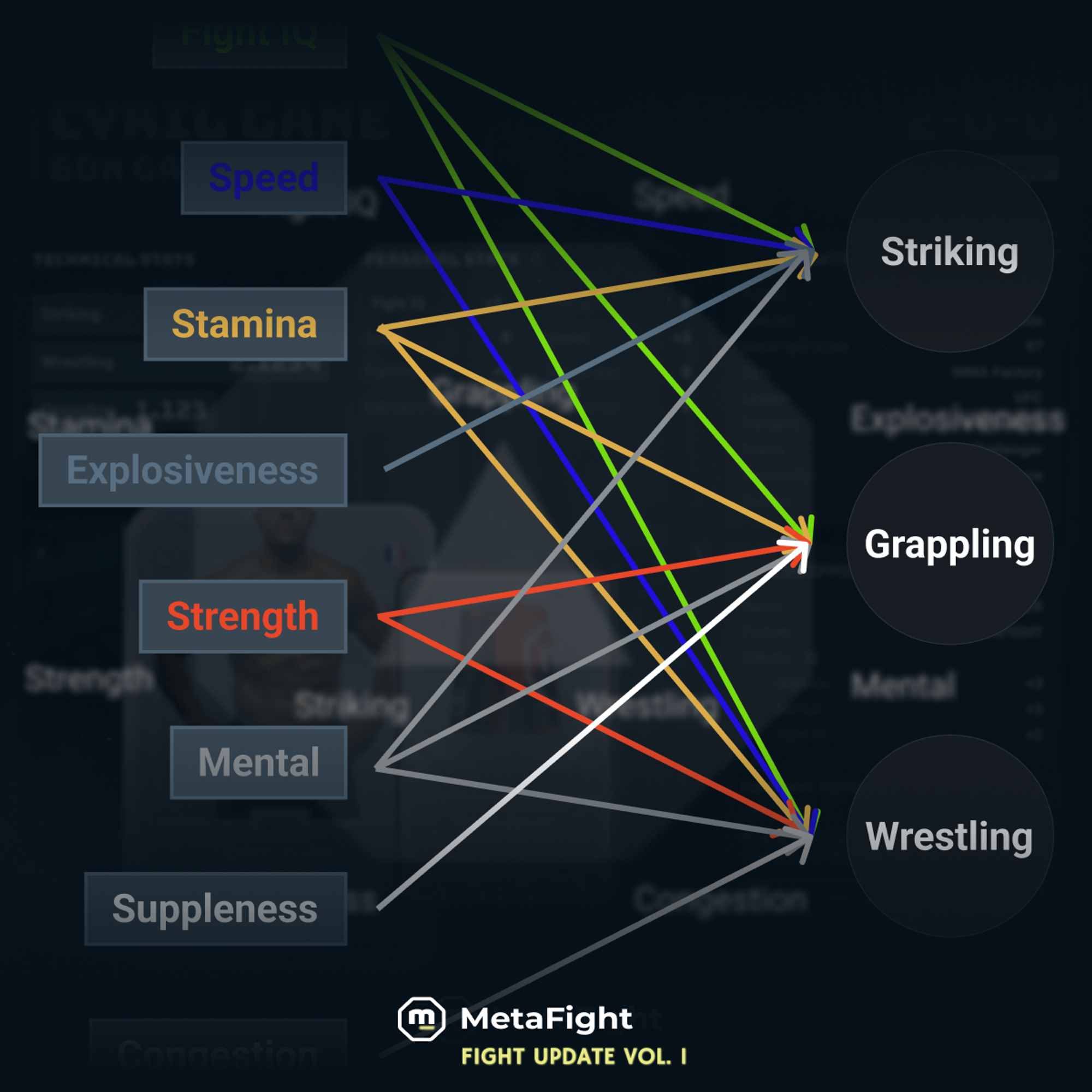 * Technical stats: Striking, Wrestling, and Grappling.