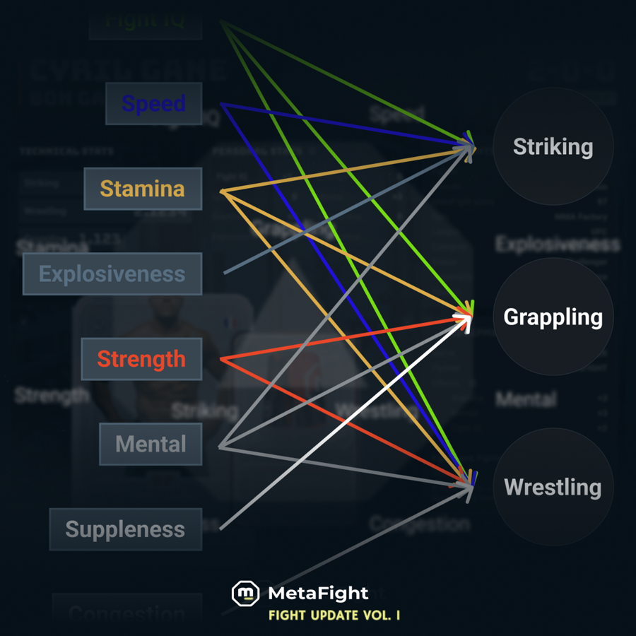Personal Stat bonus: Addition of the up to three bonuses divided by 5. Example: 90 MetaFight Score equipped with Scarlet High Kicker results in a final 90,6 MetaFight Score. 90 + ((2 Wrestling bonus + 1 Grappling bonus) /6) = 90,6 MetaFight Score.