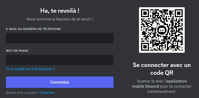 Enter your e-mail address and password Alternatively, you can use the QR Code by scanning it via the Discord mobile application, which will connect you directly.