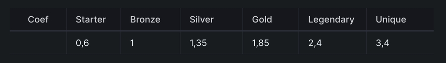 - Bronze + Silver + Gold + Legendary + Unique.